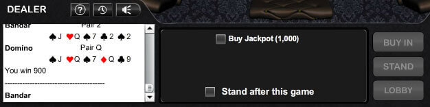 A A A K K K Q Q Q J J J 10 10 10 KQJ, KKQ, KKJ, QQJ, JJK, JJQ KQ10, KJ10, QJ10, JJ10, K10, KA9, K82, Q37, A27, 622 Dan semua kartu yang di kombinasi total jumlah 3 kartu adalah 10,20 dan 30 ???? Jika semua pemain dan bandar tidak memiliki kartu ![]() Contoh Gambar diatas: Bandar memiliki jumlah kartu 5 Maka Bandar menang dari pemain no.1 dan no.3Pemain no.2 memiliki jumlah kartu 8 Maka Pemain Jika player WIN dengan kartu A A A akan di bayar 3x lipat dari jumlah pasangan. Jika player WIN dengan jumlah kartu urutan maka akan di bayar 2x dari jumlah pasangan. Jika kartu bandar dan player TIE/SERI maka bandar WIN