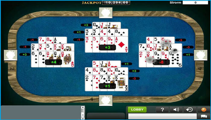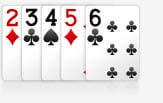 5 kartu yang memiliki nilai berurutan. Jika player lain juga memiliki kartu Straight, maka pemenang ditentukan dengan kartu yang memiliki nilai tertinggi. Kartu Ace dapat diposisikan pada urutan tertinggi maupun terendah. A,K,Q,J,10 (maka Ace adalah tertinggi), 5,4,3,2,A (maka Ace adalah terendah, 5 tertinggi). 7. Three of a Kind