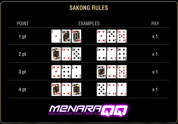 Sakong bisa juga di sebut permainan 3 Picture (3 Gambar) Dan semua pemain bisa jadi BANDAR. Permainan sakong hanya mengunakan 3 kartu remi saja dan dapat dimainkan dengan jumlah 8 orang pemain dan salah satunya menjadi bandar.Dalampermainan sakong, kartu yang yang terbesar adalah kartu yang berjumlah 10 atau 20 atau 30 dan kartu yang terkeciladalah kartu yang berjumlah 1.Dan untuk kartu King, Queen dan Jack, dihitung 10 atau 0 (nol), untuk kartu 10 akan dihitung10 (sepuluh) atau 0 (nol) sedangkan kartu AS dihitung 1 (satu)/11. Setelah semua pembagian kartu selesai maka kartuakan di adu dengan kartu bandar. |