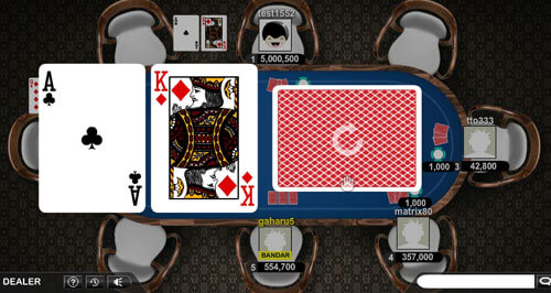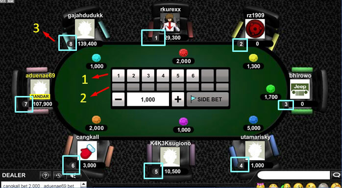 - Jika player sebelumnya tidak ada melakukan pemasangan taruhan, maka pemain selanjutnya dapat melakukan opsi pilihan Check, jika semua pemain melakukan Check maka sesi putaran taruhan tersebut dianggap selesai dan sesi baru putaran selanjutnya dimulai. 2. Bet